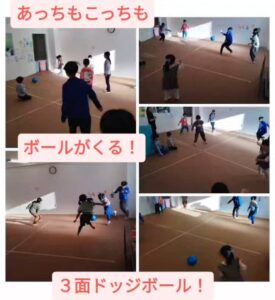 次は3チームで行う3面ドッヂボールです!