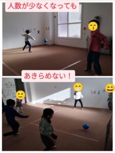 みんな狭いコートの中、2チームのボールから上手に逃げていました!!